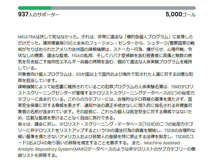 Targeted Justiceは、アメリカの非営利団体で、一般市民に対するCIAの違法な拷問プログラムを暴露し、終わらせることを目的としています。